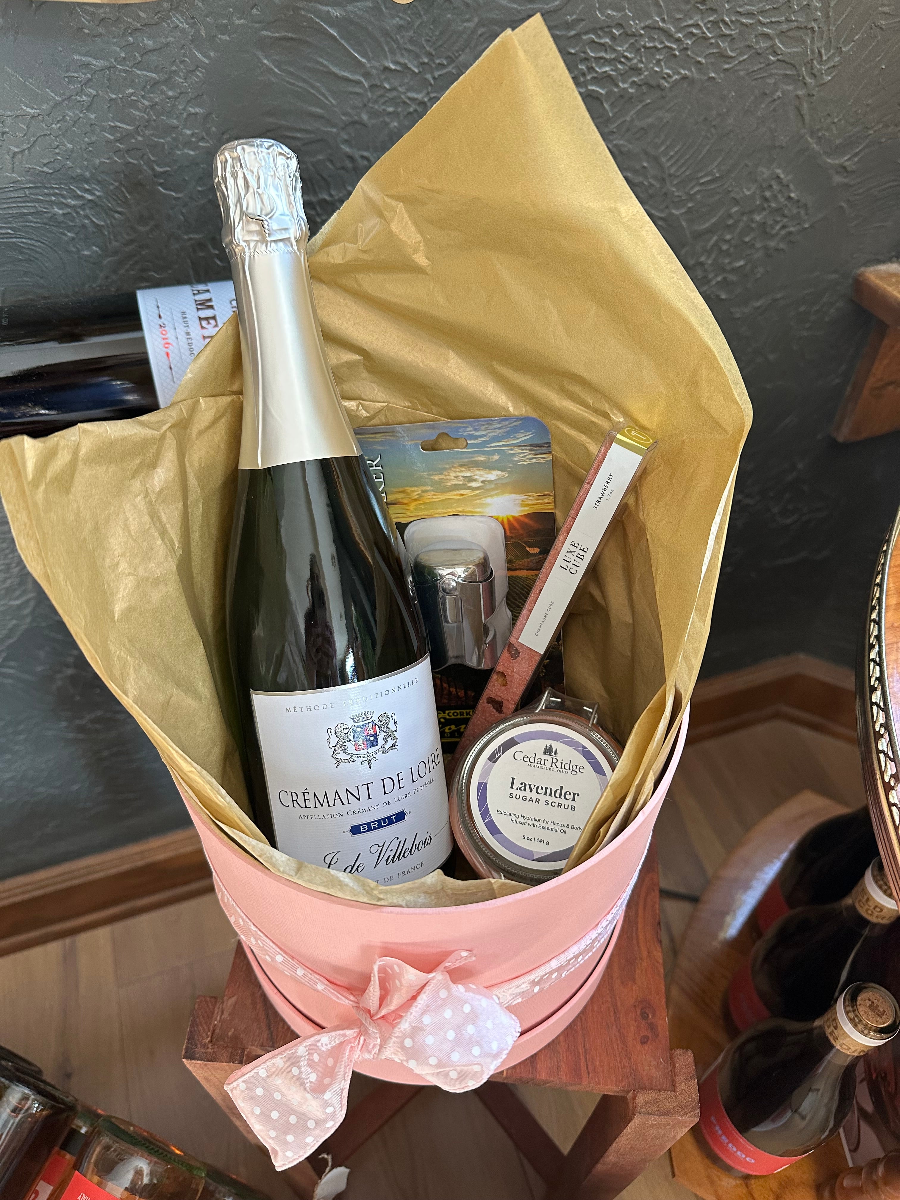 A gift box to say “I love you.” Includes a bottle of sparkling Cremant de Loire, a Champagne recorker, Lavender body scrub, and strawberry mixology cube stick. Local pickup only - no shipping.