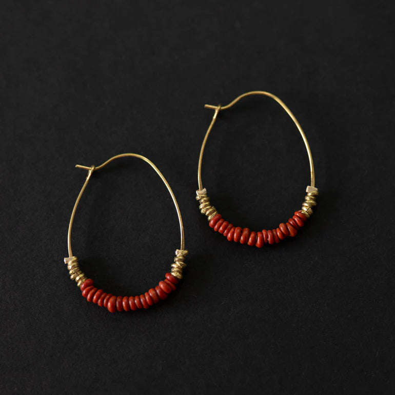 Brass oval hoops with African recycled metal and Indonesian glass in a gorgeous red orange. Just under 1.5” in length. Hypoallergenic. Lead and nickel free.
