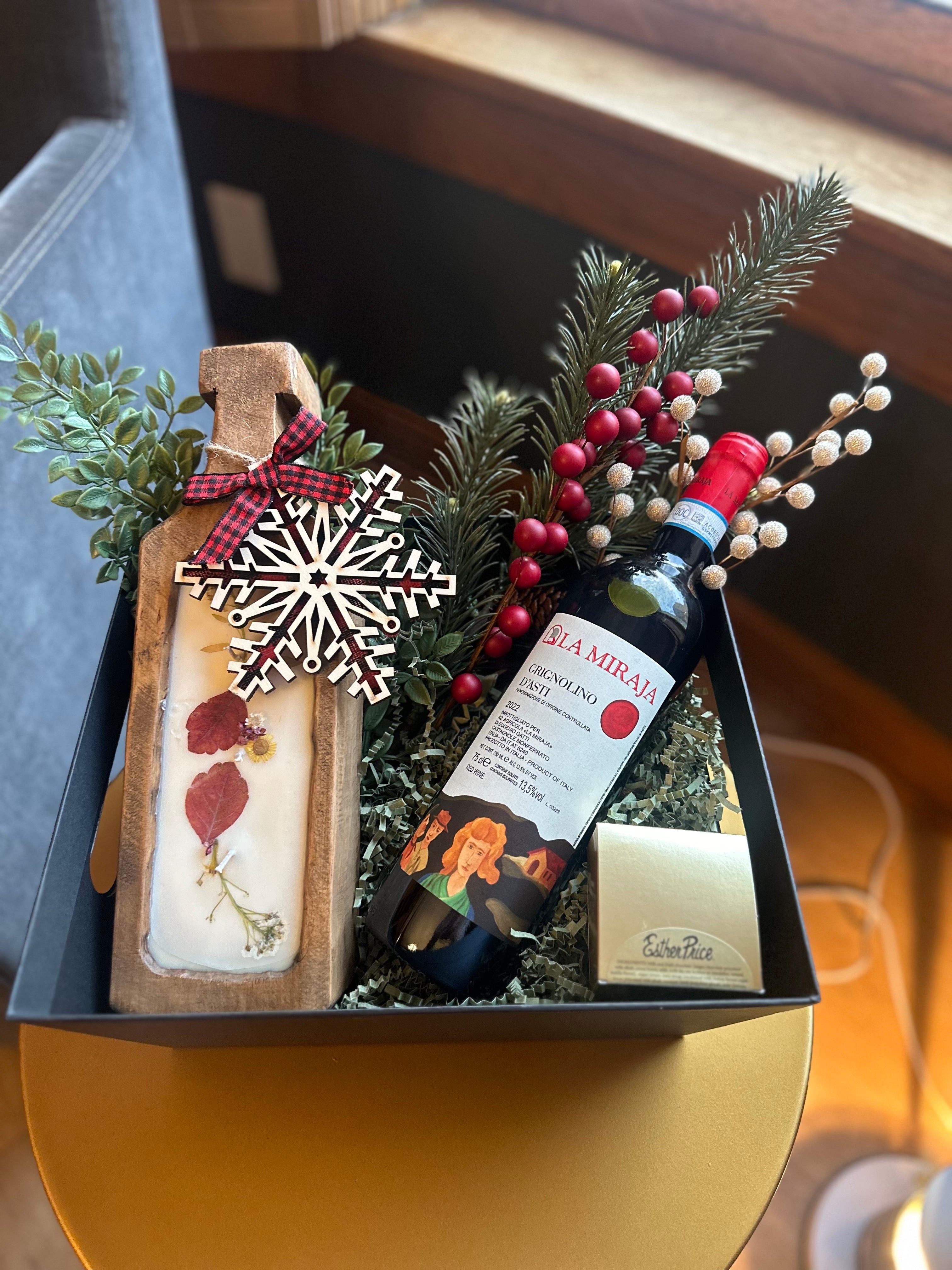 Introducing the 'Candle and Cork Collection'—crafted for wine lovers seeking a sensory journey in a basket. Discover a carefully selected bottle of wine, paired with a candle sculpted like a wine bottle, adorned with an intentionally designed crown of flowers, and emanating The Mansion on Monuments Signature Scent. Accompanied by a small, delectable box of Ester Price Chocolates. Indulge in this curated ensemble celebrating fragrance, taste, and ambiance.